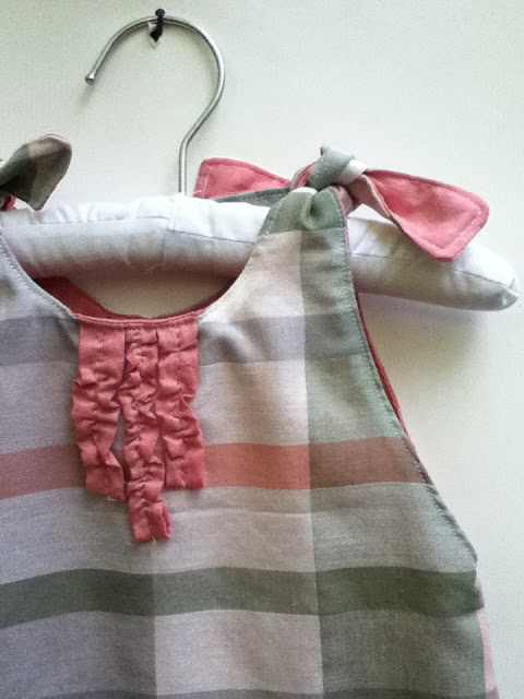 For her gift I made her a little dress from vintage fabric I got from Great Grandma. I used the Kaileigh Dress pattern from Grits and Giggles. The dress is reversible! For this dress though only the plaid side had decoration the reverse side is just the plain pink you see in the ruffles and the ties at the top.